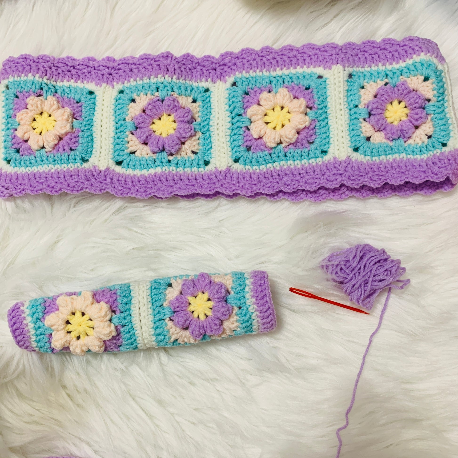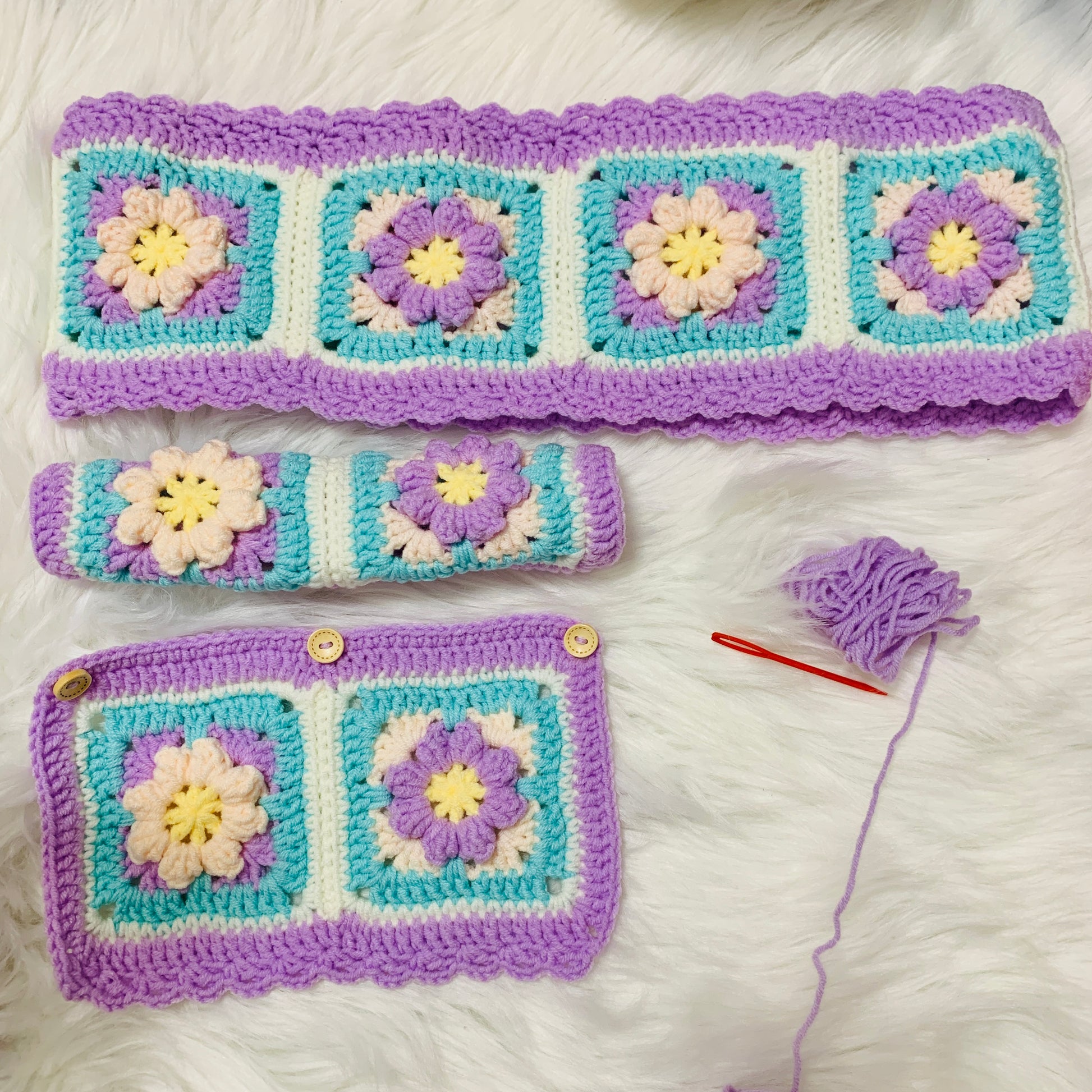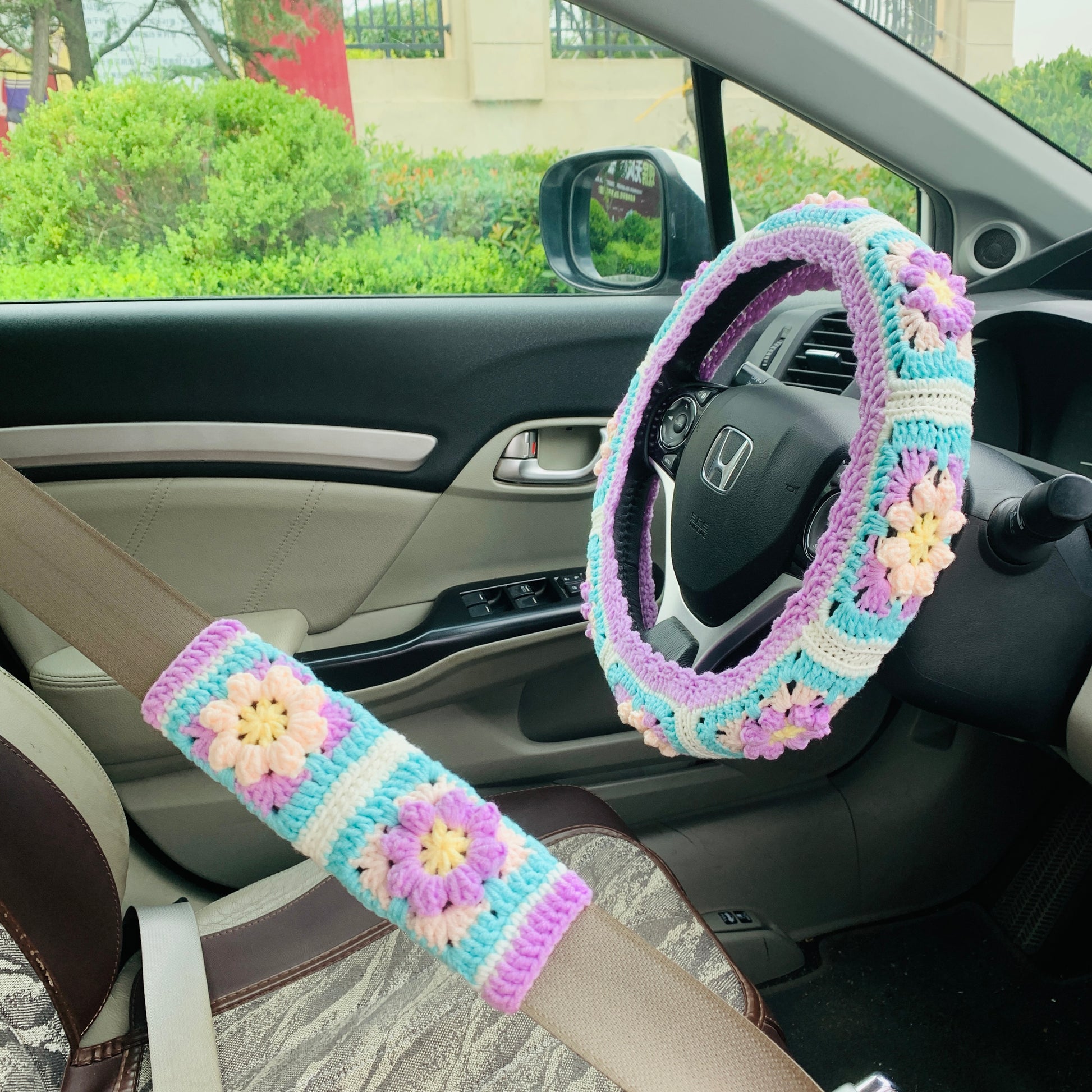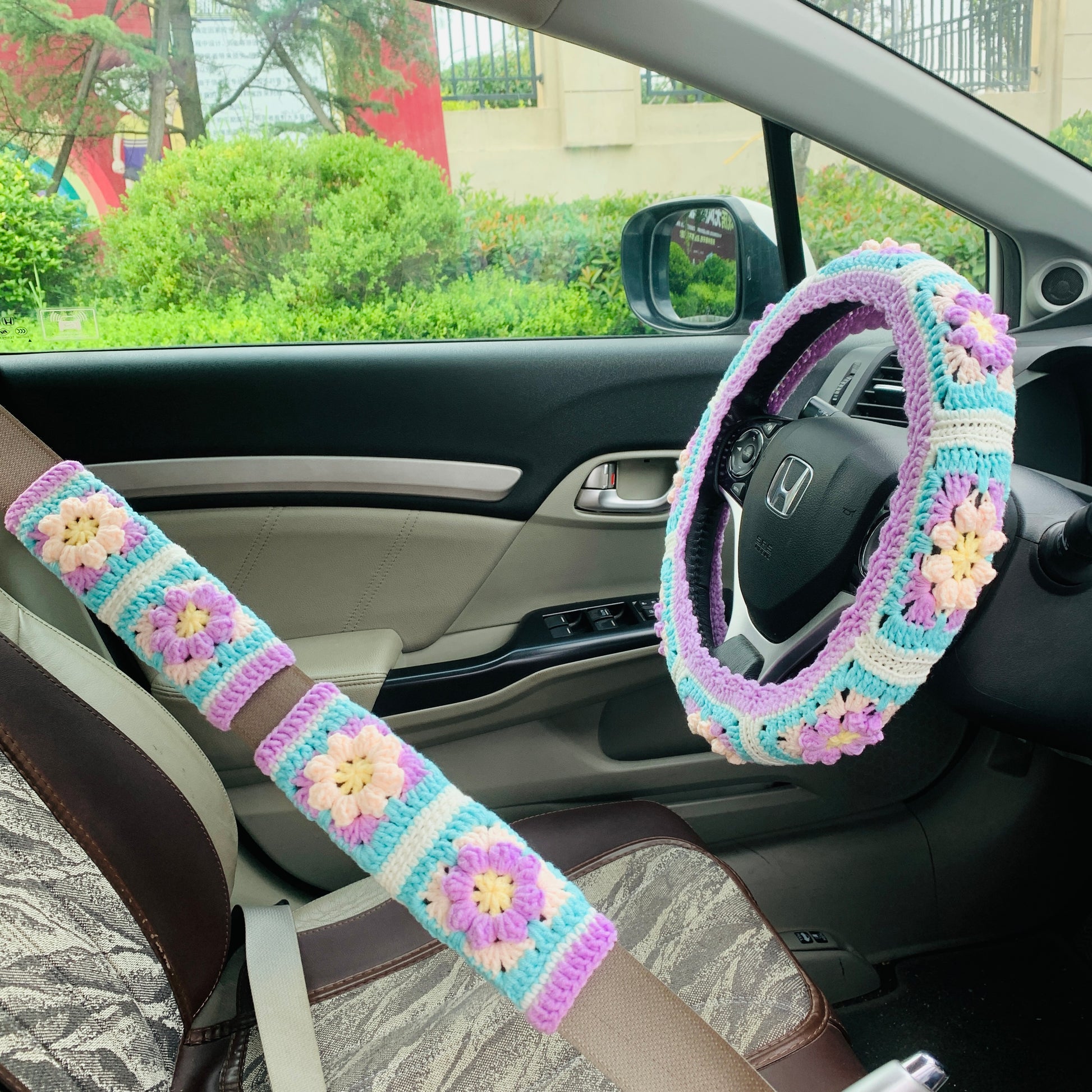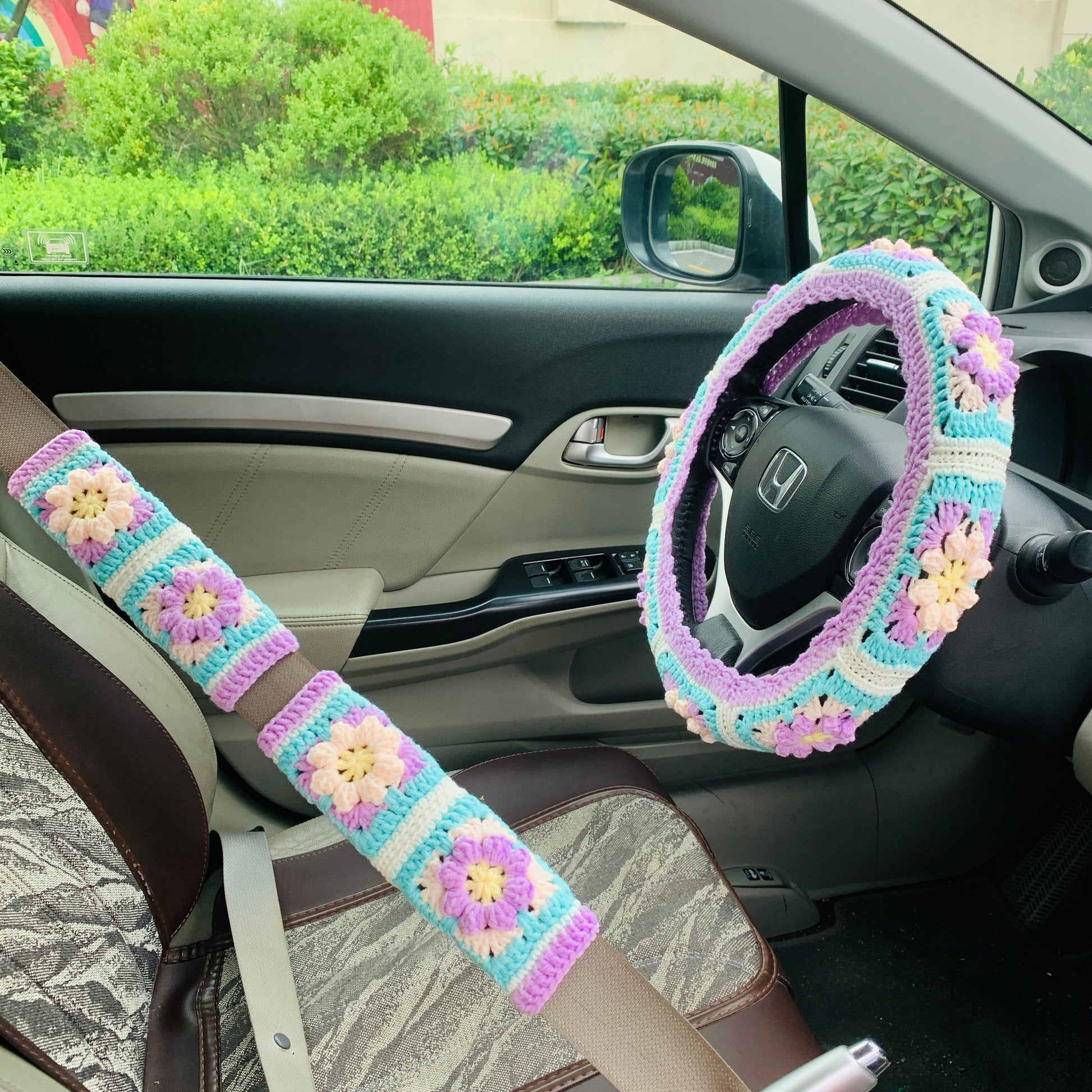 Handmade crochet Steering Wheel Cover for women, cute purple daisy flower seat belt Cover, Car interior Accessories decorations