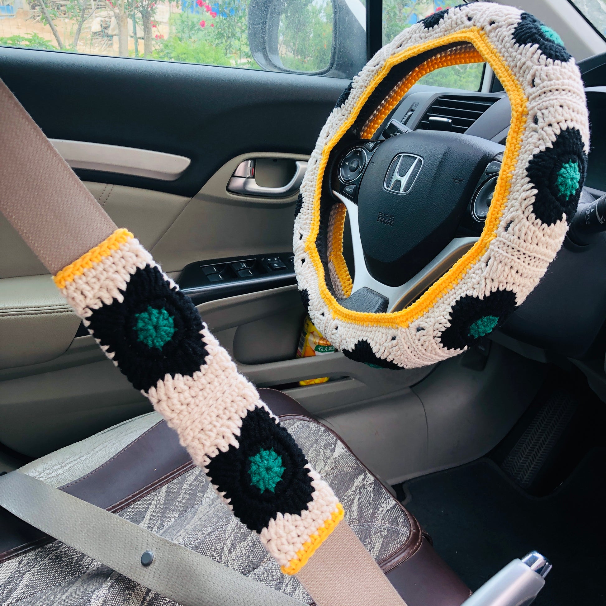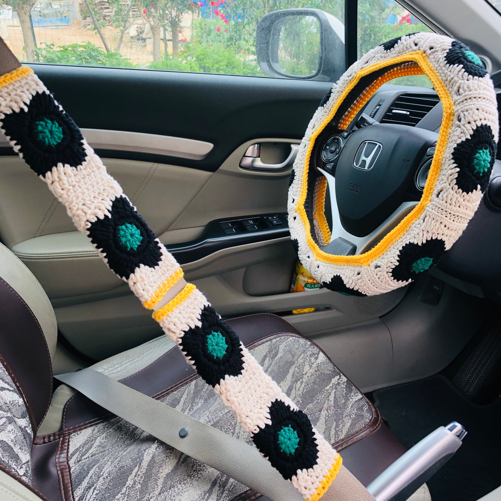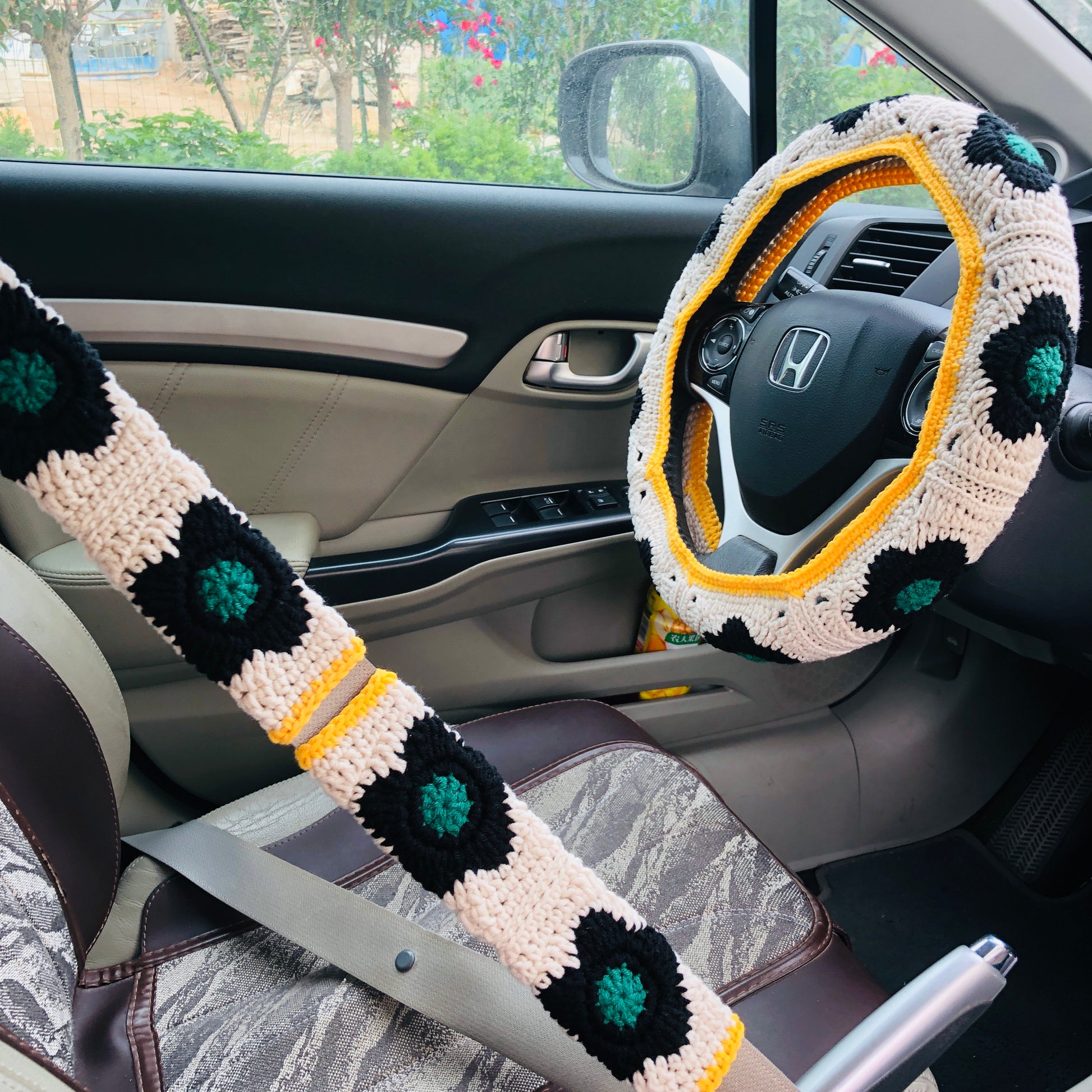 Steering Wheel Cover for women, Crochet cute Beige flower seat belt Cover, Car Accessories decorations