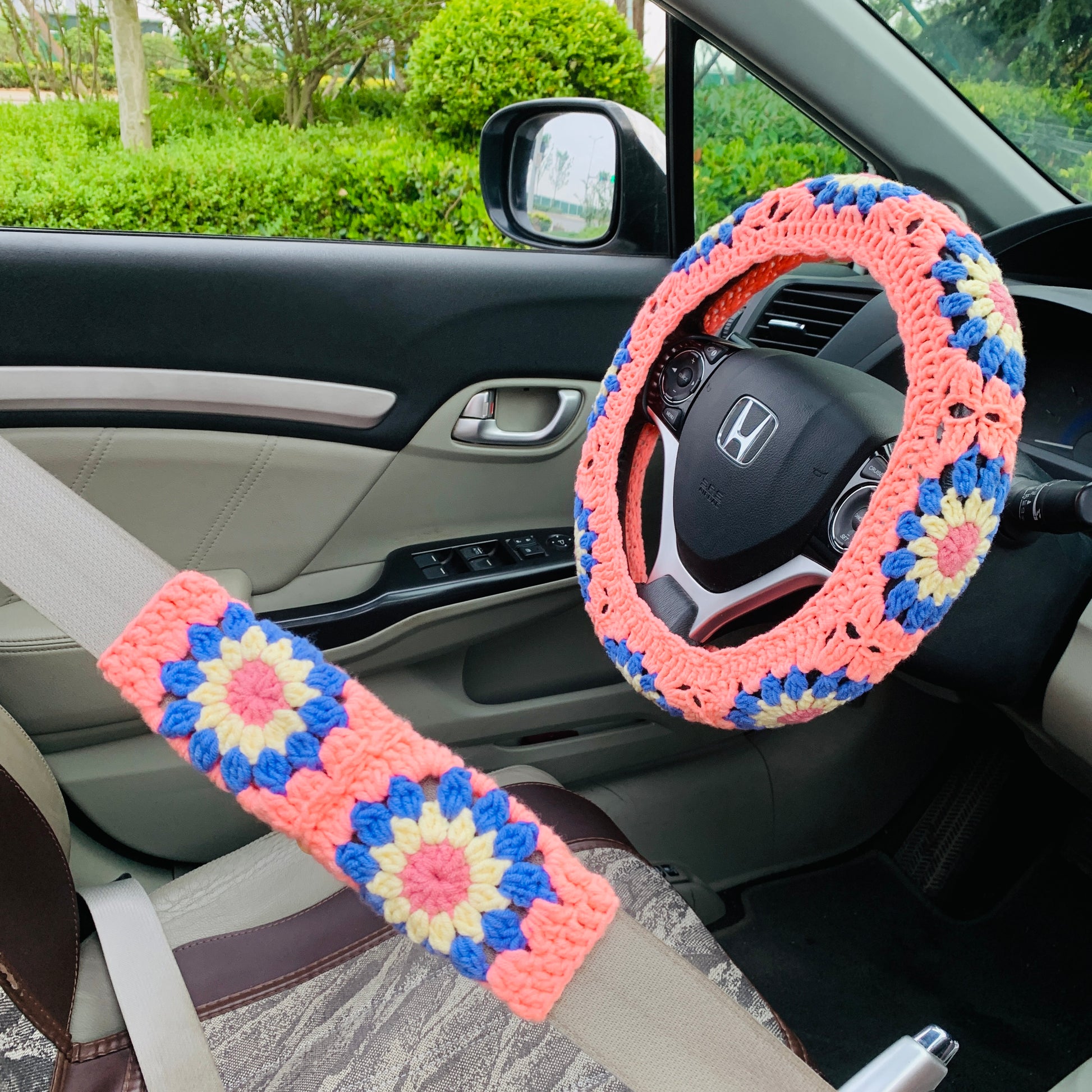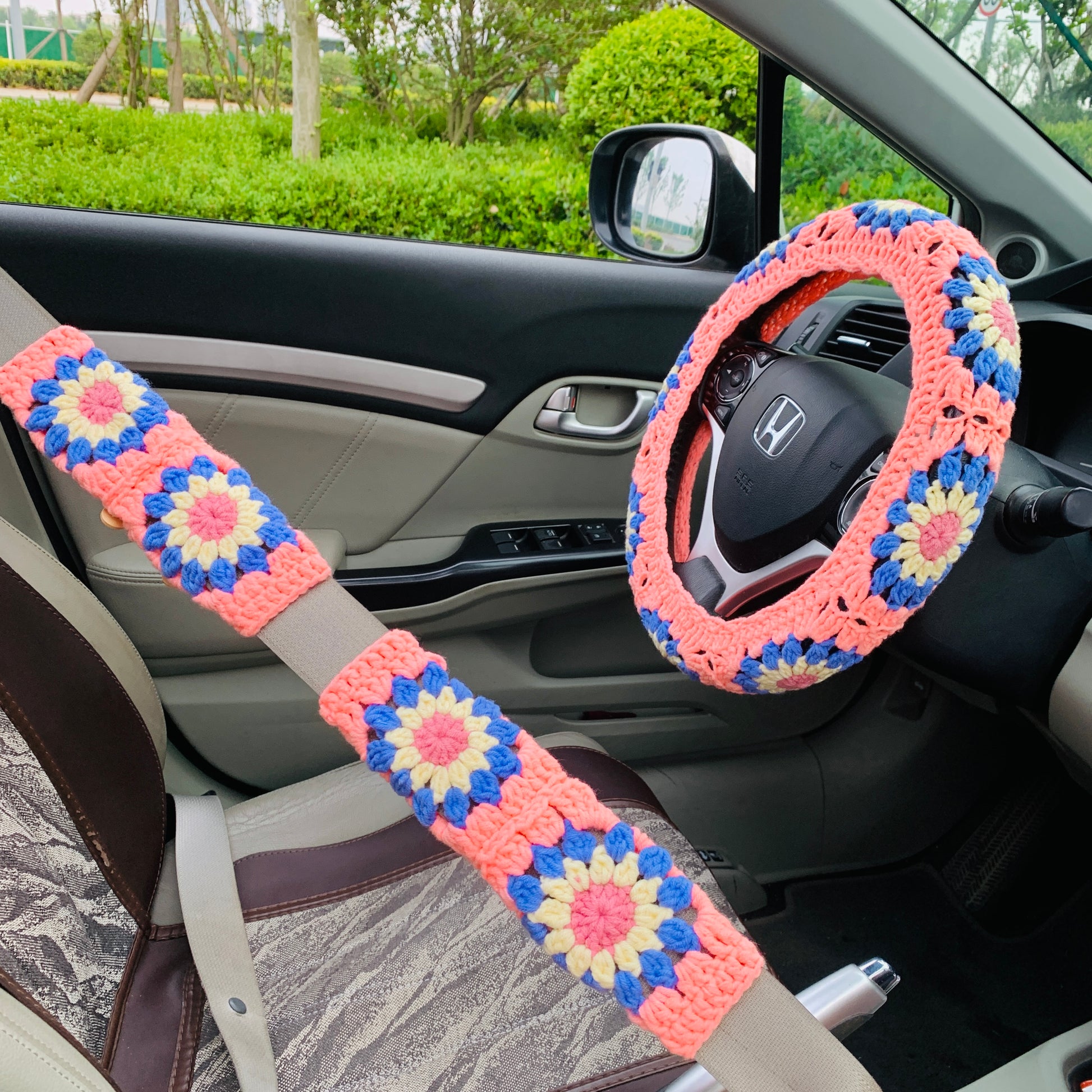 Steering Wheel Cover for women, Crochet cute flower seat belt Cover, Car Accessories decorations car Interior decor