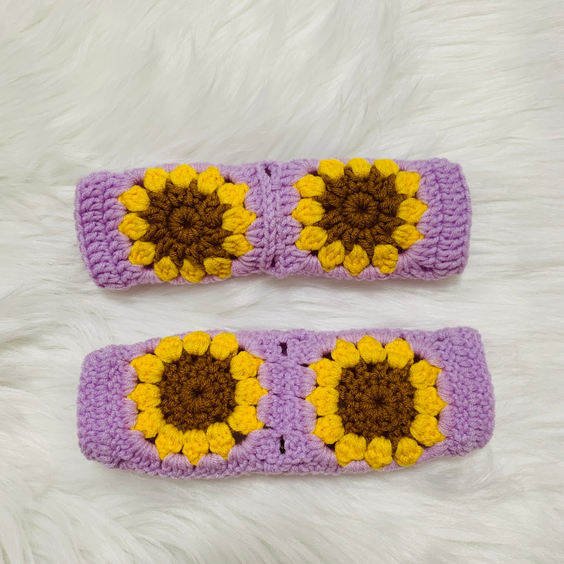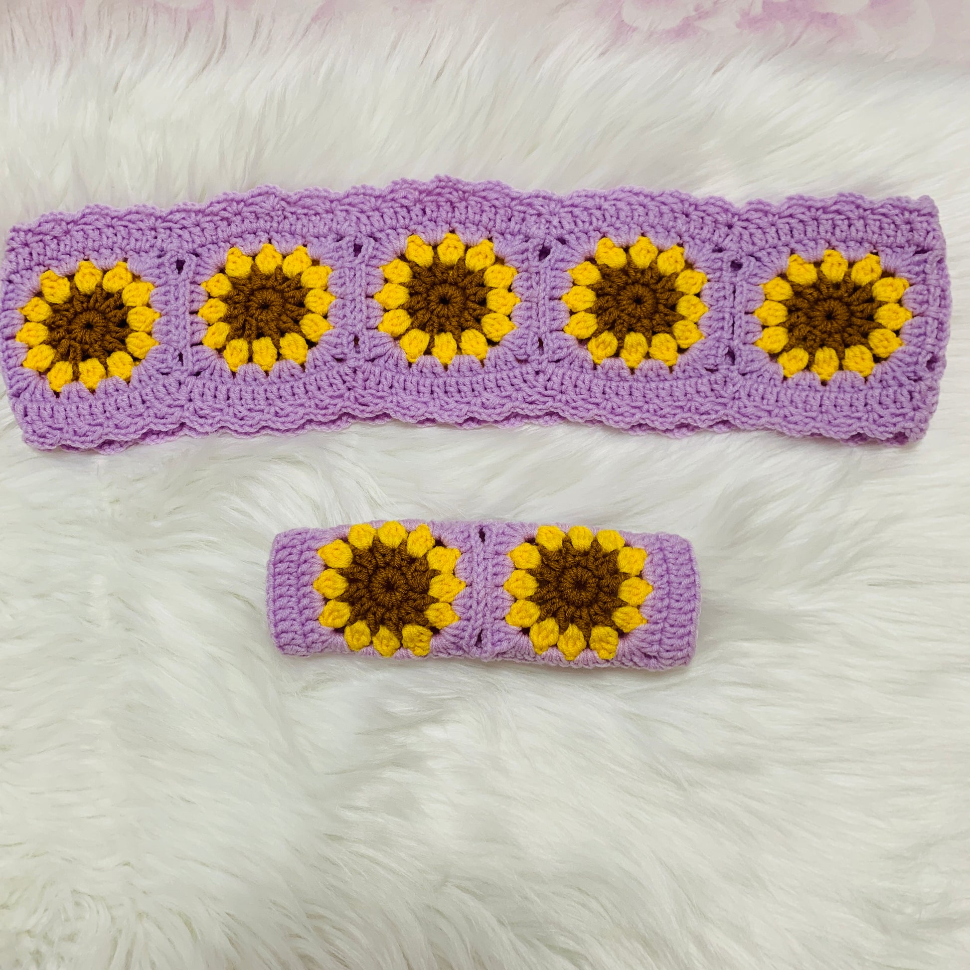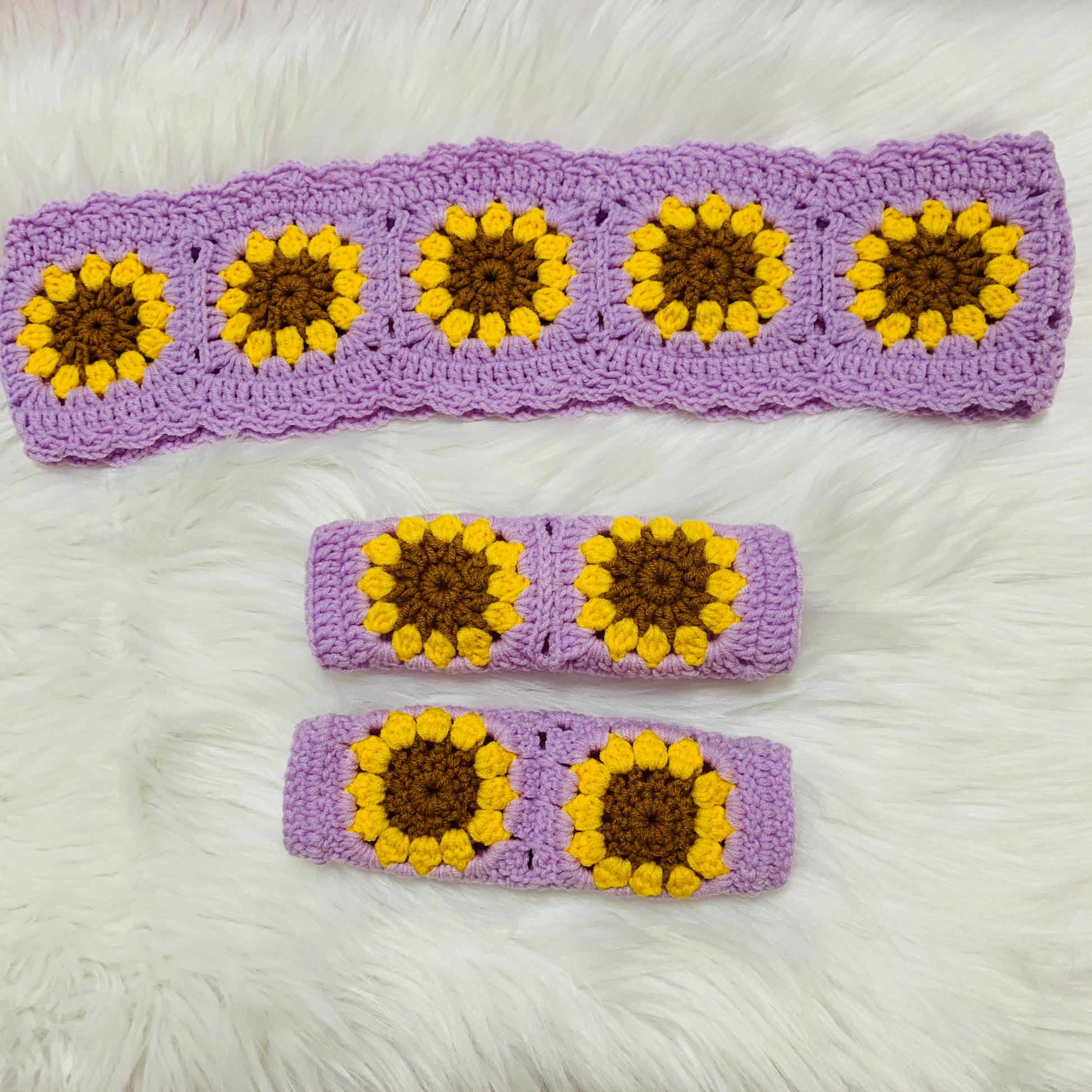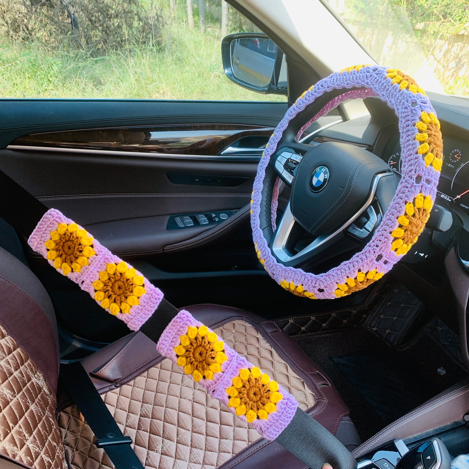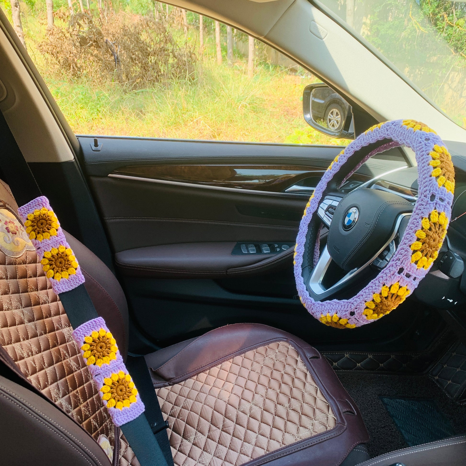 Steering Wheel Cover for women, Crochet Light Purple flower seat belt Cover, Car Accessories decorations