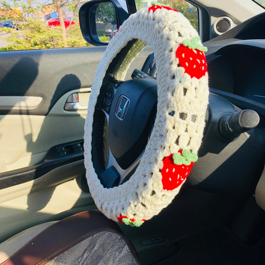 Steering Wheel Cover for women, Crochet cute Fruit Strawberry flower seat belt Cover, Car Accessories decorations