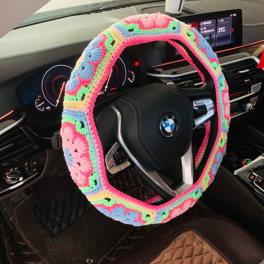 Handmade crochet Steering Wheel Cover for women, cute daisy colorful flower seat belt Cover, Car interior Accessories decorations