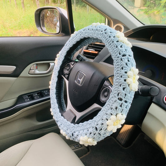 Handmade crochet Steering Wheel Cover for women, cute daisy flower seat belt Cover, Car interior Accessories decorations