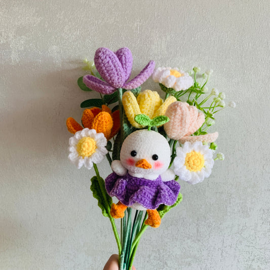 Crochet flowers, Duck with grass Tulip Daisy flower ornaments, cute A bunch of flower Anniversary bouquet Gift for her