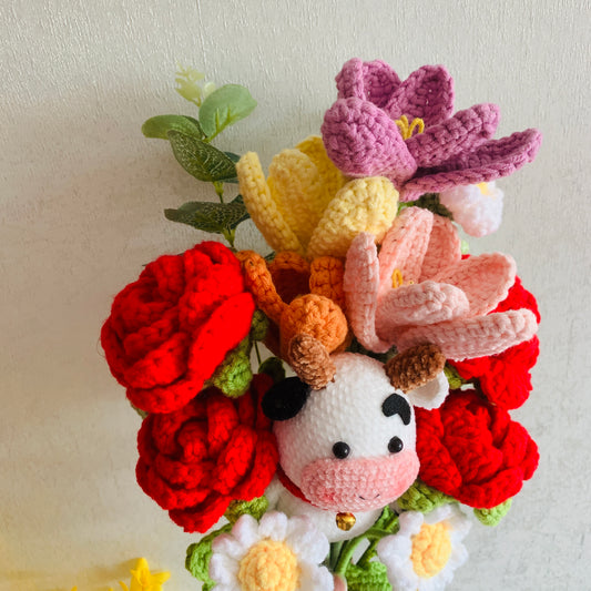 Crochet flowers, Cow red rose Tulip Daisy flower ornaments, cute A bunch of flower Anniversary bouquet Gift for her